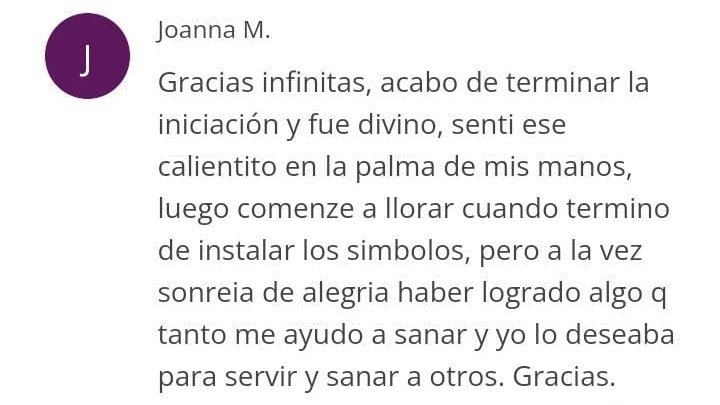 “…Siento un profundo respeto por esta formación. Realmente no creí posible aprender Reiki a distancia, y debo decir que estaba completamente equivocada. Hoy sé que somos seres divinos, que la vida merece ser honrada y que vinimos al mundo para canalizar amor…”